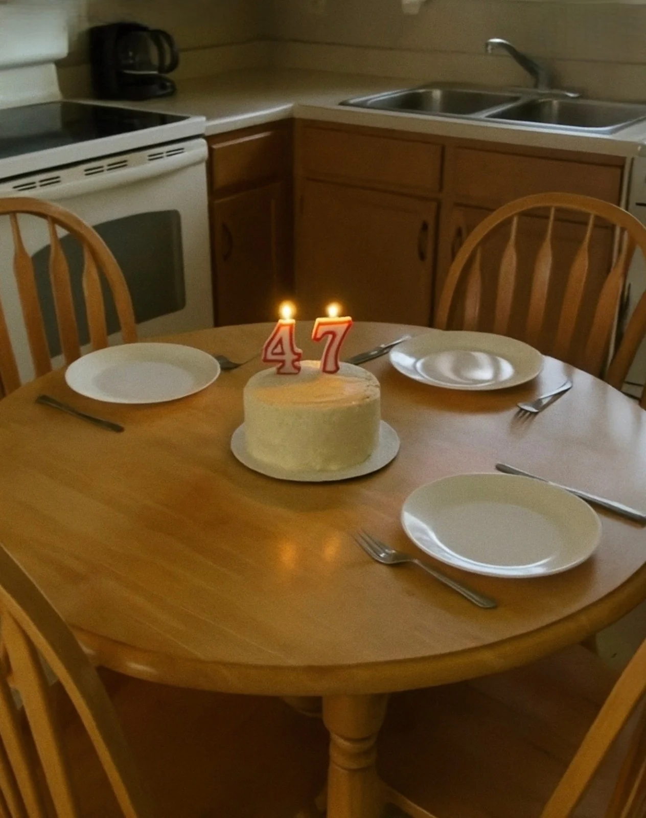Small and round, with two candles shaped like a 4 and a 7 stuck right in the center. I didn’t even like cake anymore.