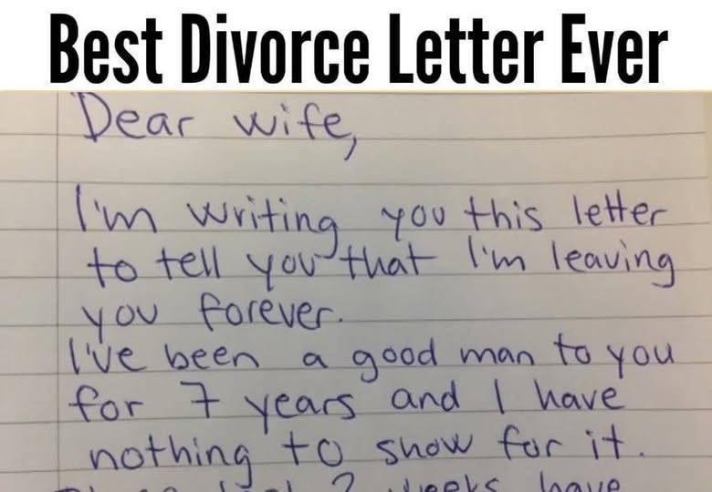 The husband writes to his wife, expressing his decision to leave after seven years of marriage. He cites recent events that made him feel unappreciated: