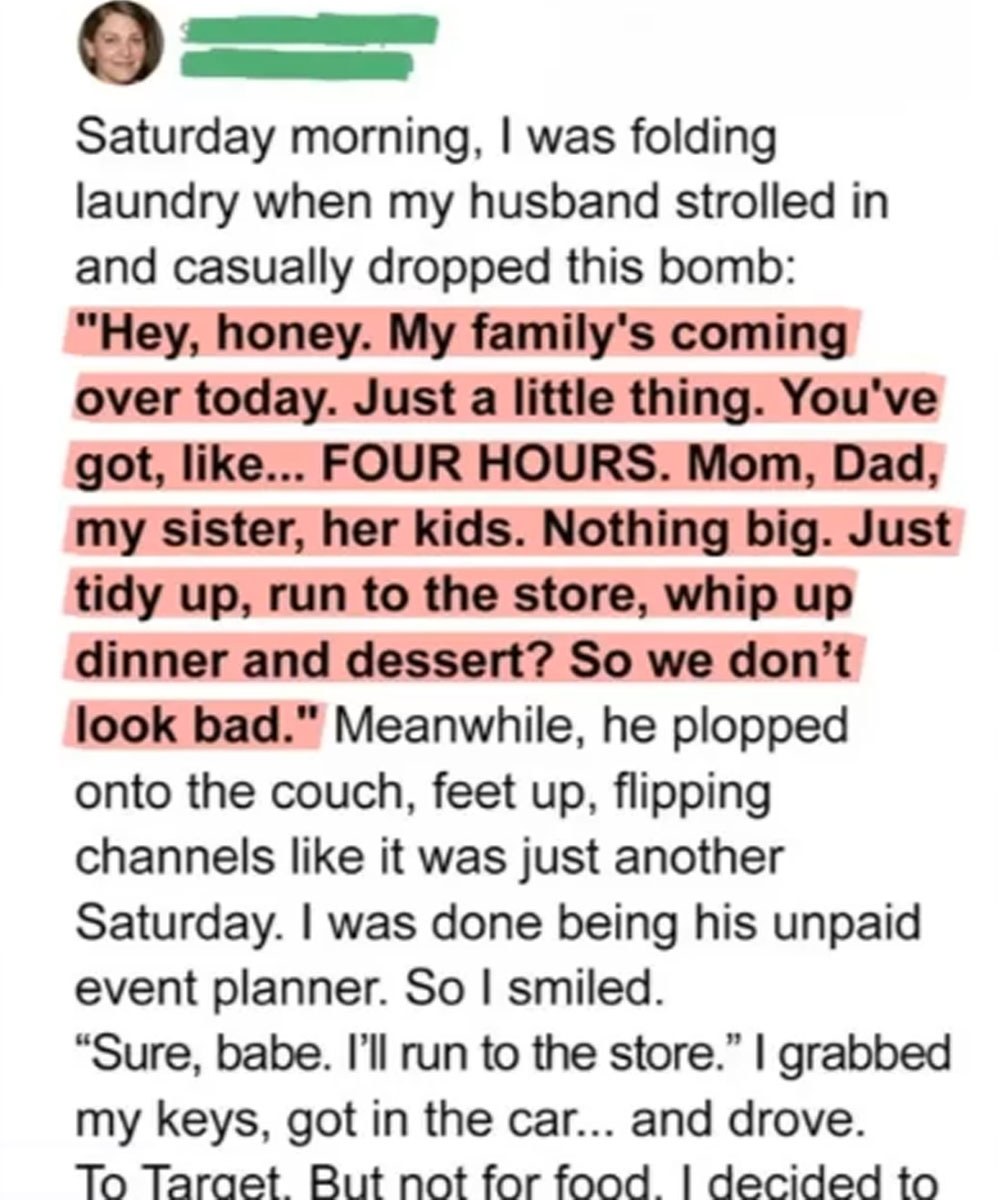 For the past two years, the user’s husband had a habit of springing family visits on her with little to no notice, expecting her to clean, cook, and entertain without warning. Though she initially went along with it, she had finally reached her breaking point on a quiet Saturday when he announced another “small” visit just four hours away.