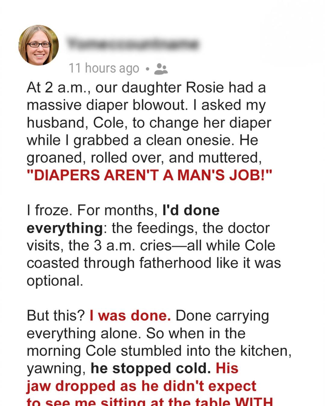 When our daughter Rosie was six months old, she woke up crying at 2 a.m. I was exhausted—physically, emotionally, mentally. I nudged my husband, Cole, asking him to change her. He refused, muttering, “Diapers aren’t a man’s job.” Those words broke something in me. After cleaning up Rosie alone,