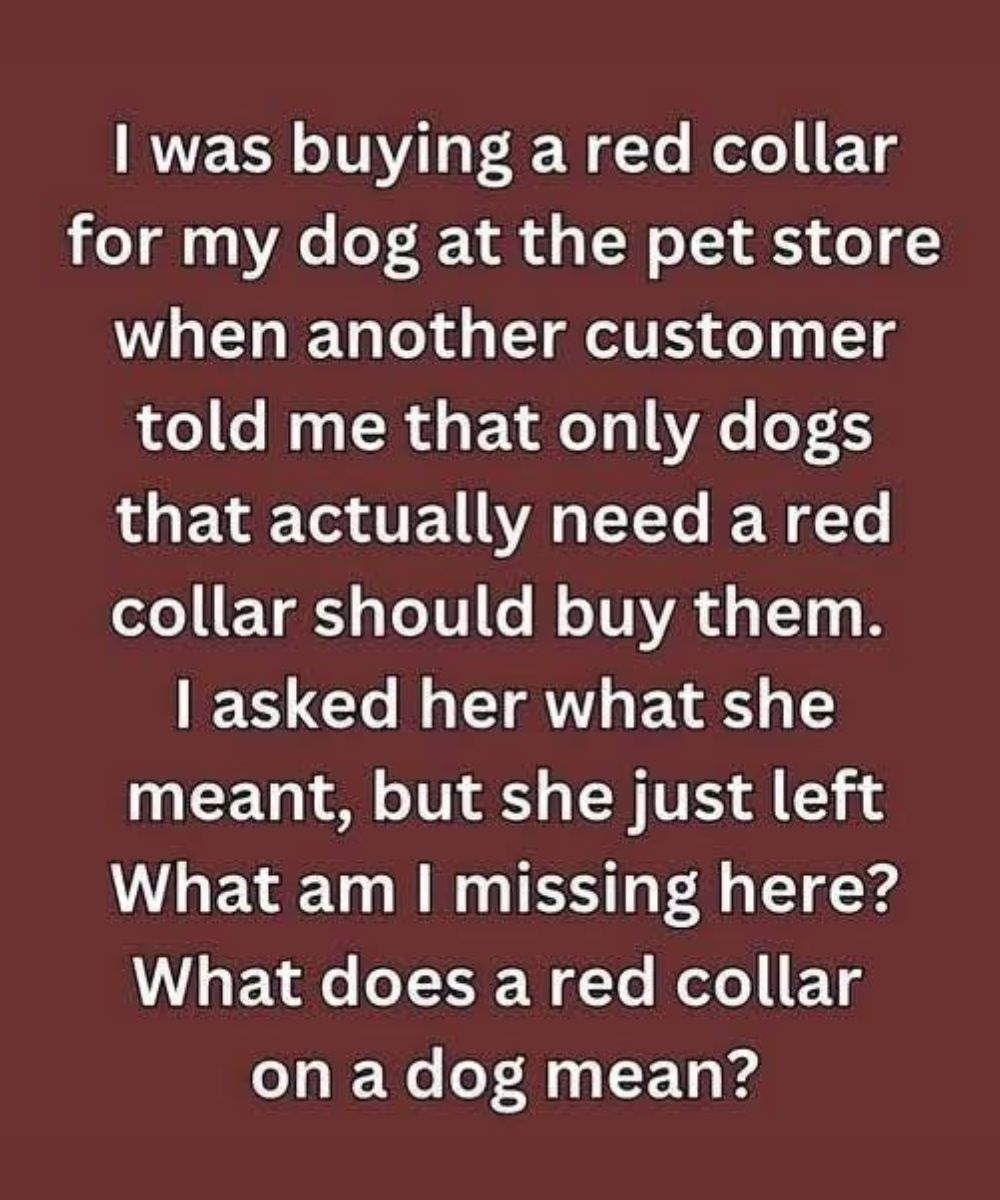 I asked her what she meant, but she just left. What am I missing here? What does a red collar on a dog mean?