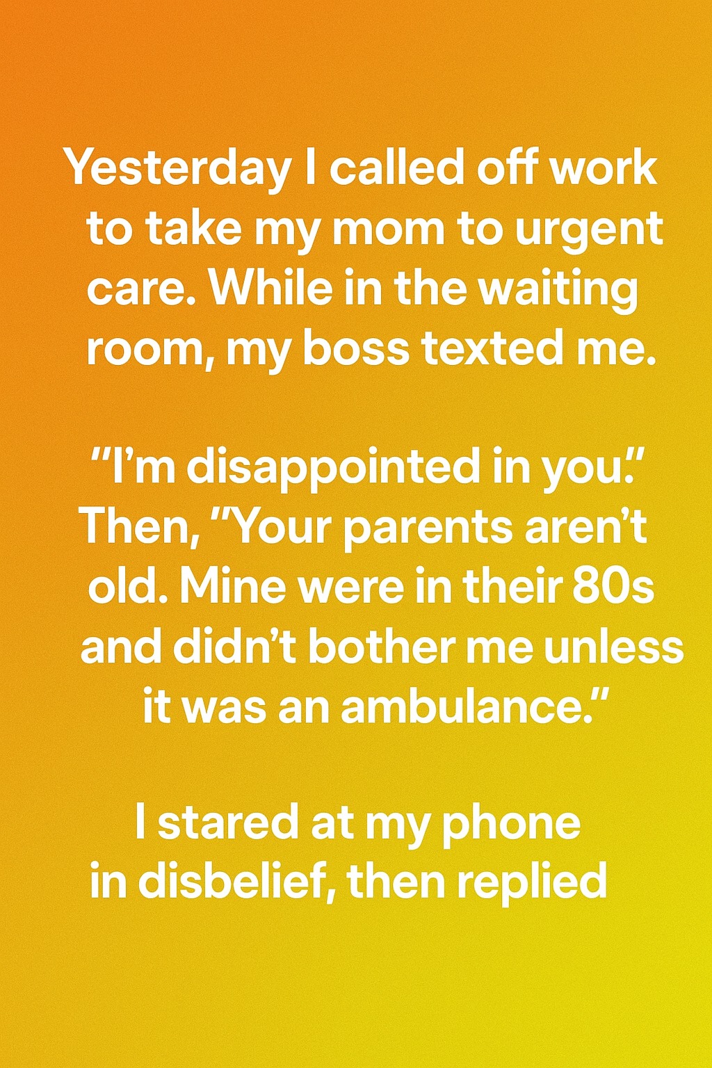 Yesterday, I had to call off work unexpectedly to take my mom to urgent care. She wasn’t feeling well, and her symptoms had come on suddenly. I didn’t want to risk waiting, so I canceled my day and rushed her to the clinic. While sitting in the waiting room, my heart raced as I kept glancing over at her. She tried to smile, insisting she’d be fine, but I could see the worry in her eyes. Just then, my phone buzzed. It was a message from my boss. “I’m disappointed in you,” it read.