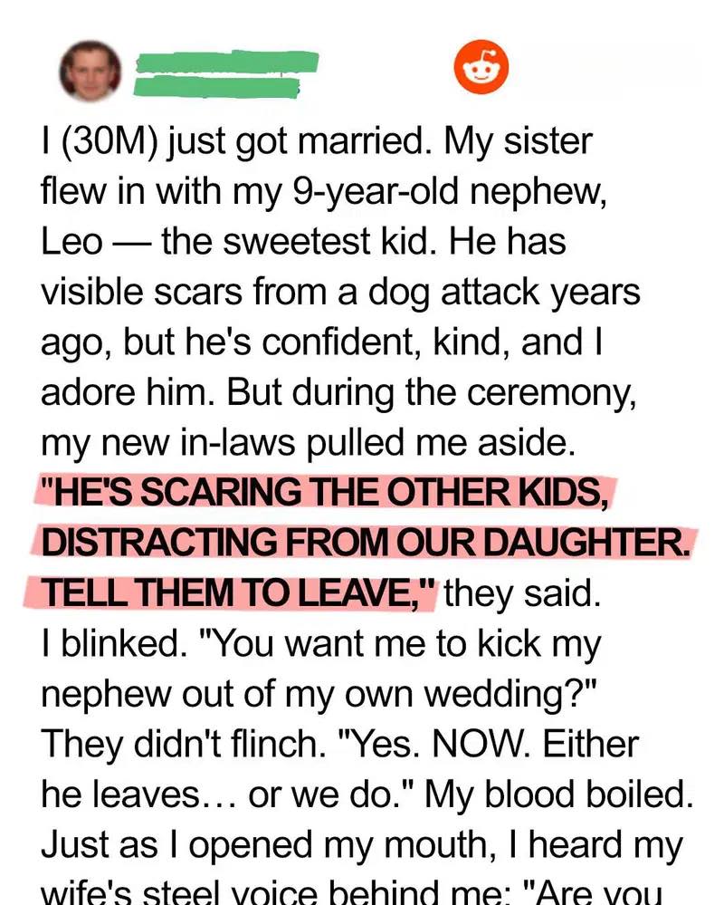 My In-Laws Tried to Ban My Scarred Nephew from Our Wedding — My Wife’s Response Left Them Speechless