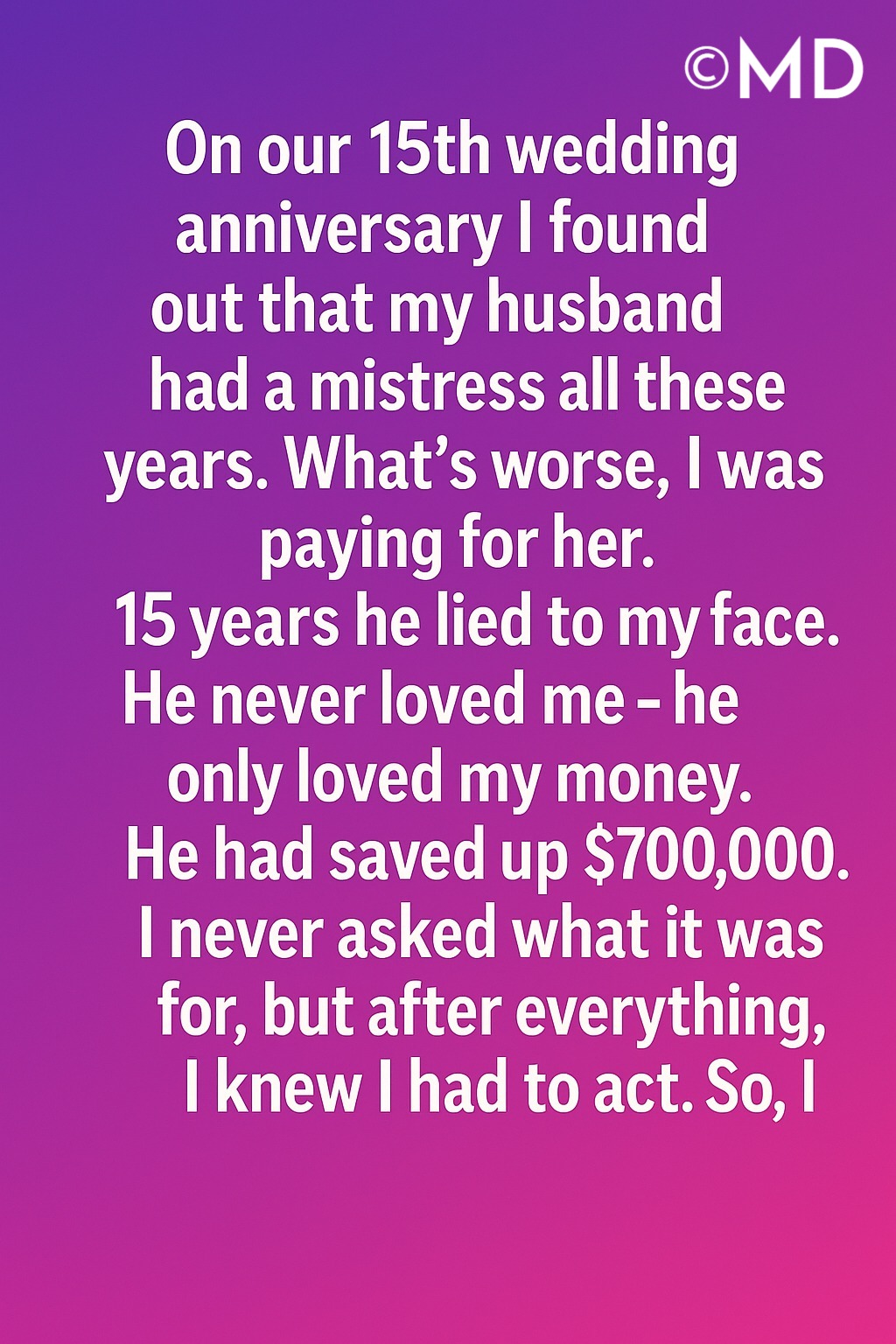 On our 15th wedding anniversary, I discovered a truth that shattered everything I thought I knew. For all those years, my husband had been secretly supporting another woman—and without realizing it, I had been paying for every part of their hidden life. Fifteen years of smiles, conversations, and shared moments suddenly felt like a carefully constructed illusion. He hadn’t stayed for love; he had stayed for comfort, stability, and my financial support. And when I learned he had quietly saved $700,000, I realized just how long he had been preparing for a future that didn’t include me.