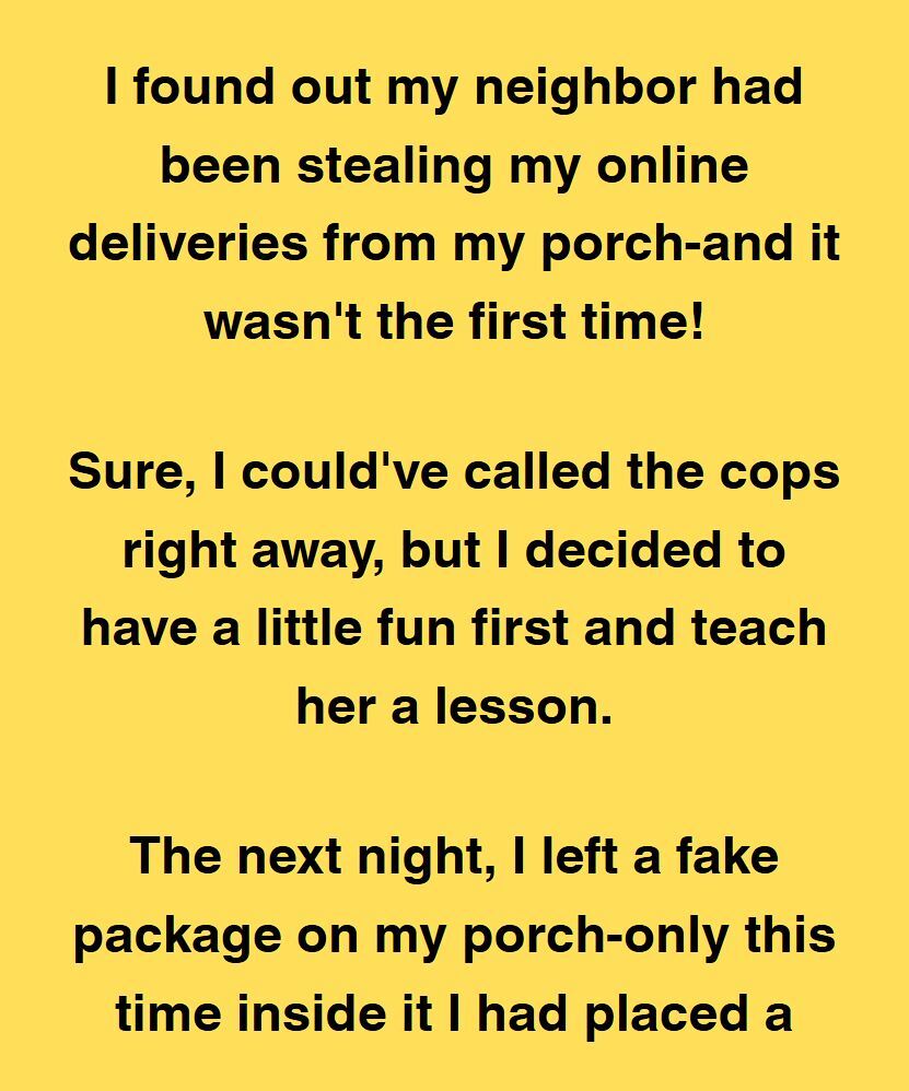“I found out my neighbor had been stealing my packages for a while. I could’ve called the cops, but nah—