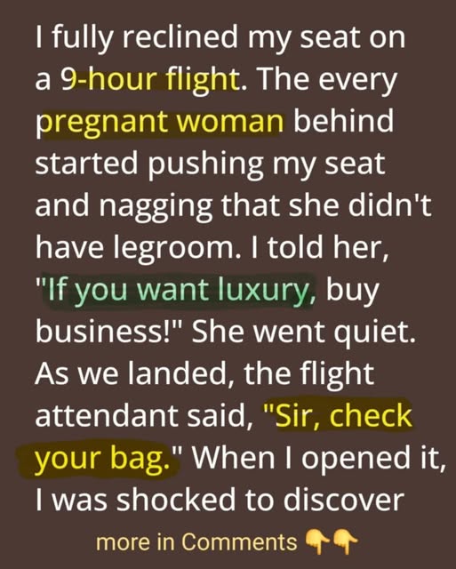 “If you want more comfort, pay for business class!” She didn’t respond, and later, he noticed she was no longer in her seat. I was curious, so I asked a flight attendant where she went. The stewardess told me they moved her to,an empty seat in business class to prevent any more issues. As the flight was ending, a flight attendant came up to me with a surprising message: “Sir, you might want to check your bag.” Confused, I opened it and found a business class amenity kit inside. It had earplugs, an eye mask, toiletries, and a note. The note said: “Kindness is free and makes the,