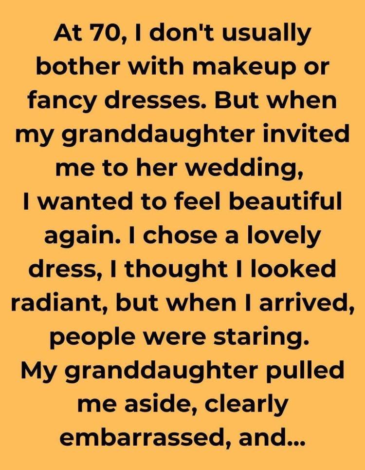 At 70, I don’t usually bother with makeup or fancy dresses. But when my granddaughter invited me to her wedding, I wanted to feel beautiful again. I chose a lovely dress, styled my hair, and spent hours doing my makeup. I thought I looked radiant, but when I arrived, people were staring.