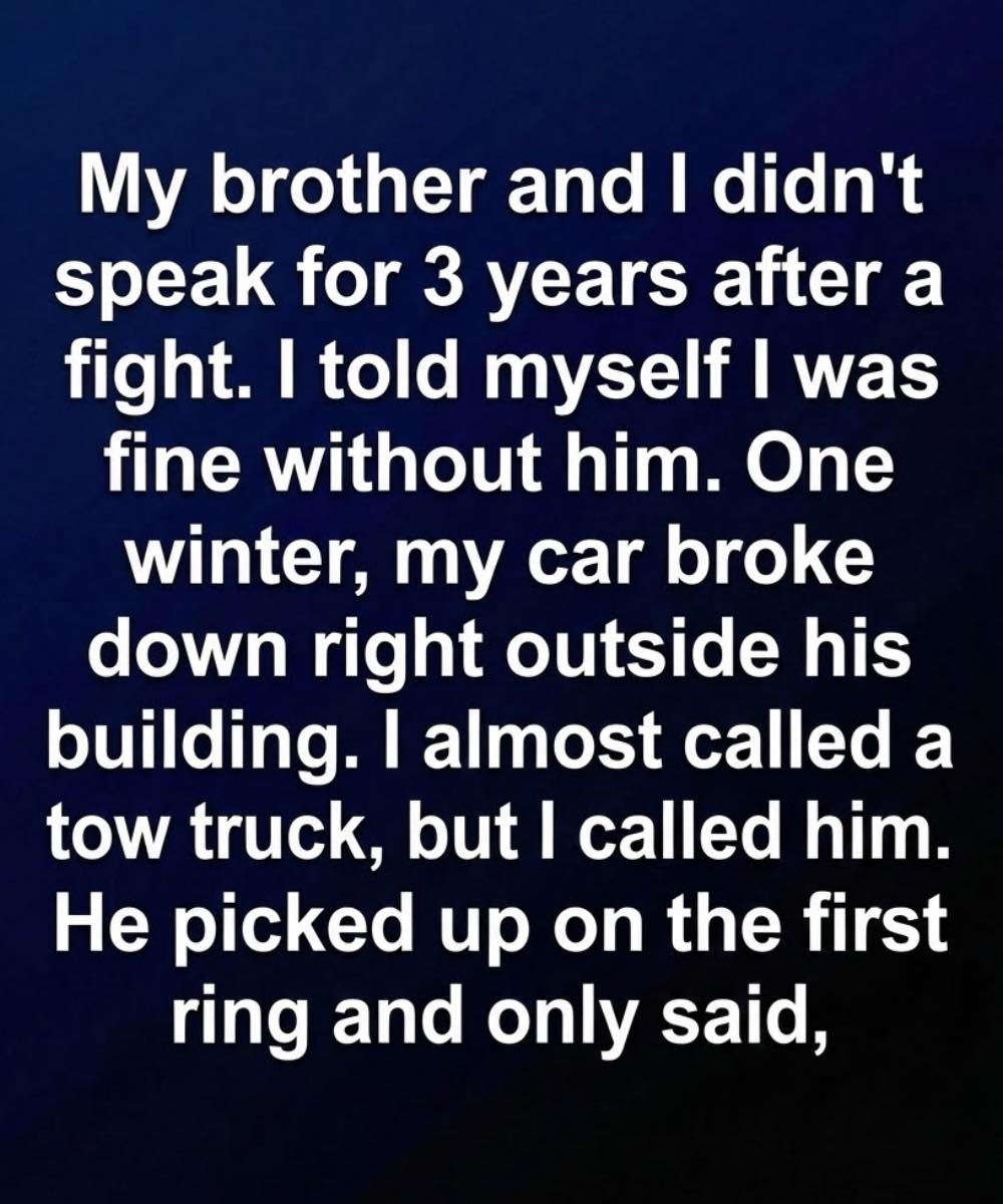 He came down bundled against the cold, just as practical and calm as he’d always been. He didn’t mention our fight. Didn’t ask why it had taken me so long to call. He helped push the car, made calls, and stayed until everything was resolved. Only afterward did we go inside, hands wrapped around warm mugs, exchanging tentative smiles while talking about nothing important at all.