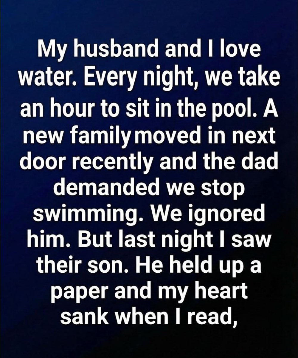 Then one night, as we were standing by the pool, towels wrapped around our shoulders, I sensed movement near the fence. I turned and saw their son—maybe twelve years old—standing very still on the other side. He didn’t climb. He didn’t call out. He simply pressed a folded piece of paper against the wooden slats and waited.