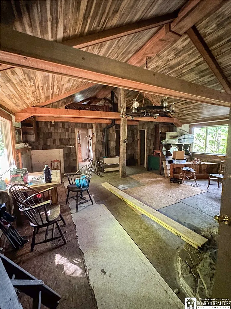 Set on 1.3 acres of wooded land in Allegany, the surroundings provide both privacy and a strong connection to nature. Tall trees and open space create the kind of peaceful environment that’s hard to find, making it ideal for those looking to step away from the noise and distractions of everyday life. The existing structure already includes a spacious covered front porch, perfect for relaxing outdoors, along with a wood stove that adds a touch of rustic charm and practicality for colder seasons.