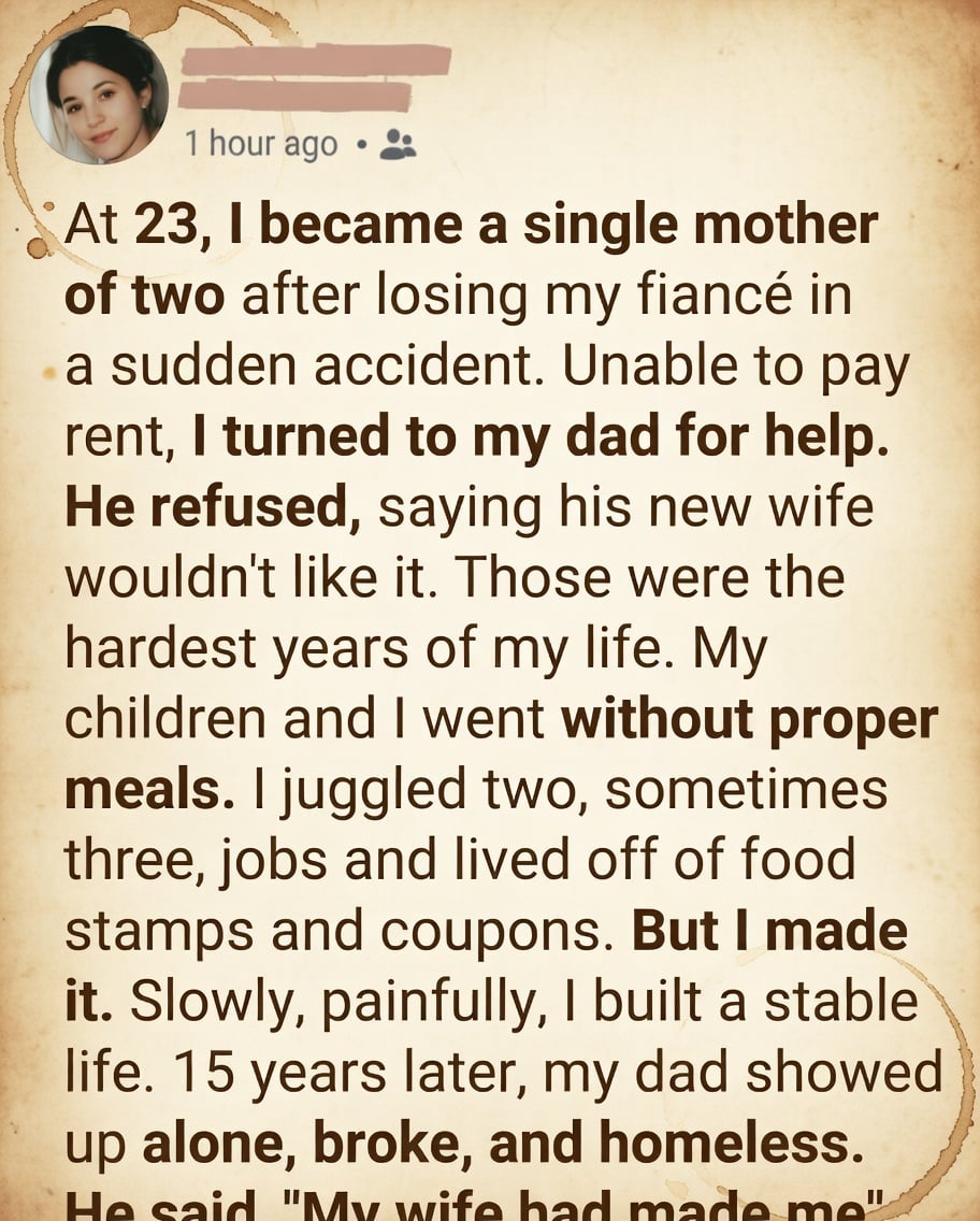 Years of scraping by hardened into a quiet, steady strength. I built a home my children could trust, a life where the lights stayed on because I willed them to. So when my father appeared at my door, older and humbled, his regret collided with the memory of that cold doorway. I heard his apology, but I also heard the echo of my own pleading from years before. In the end, I chose the only thing I’d ever been offered the power to choose: to protect the life I had built, even if it meant leaving him on the other side of the door.