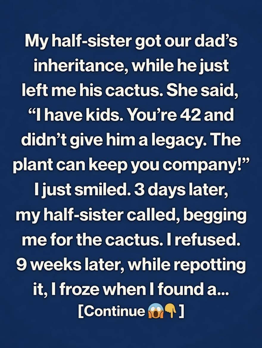 Grief didn’t hit her like a storm. It crept in, quiet, almost polite. No one expected the will to change anything—until her half-sister got everything, and she got… a cactus. The room shifted. The insult stung. But at home, alone, under a dim kitchen light, she noticed something stran… Continues…